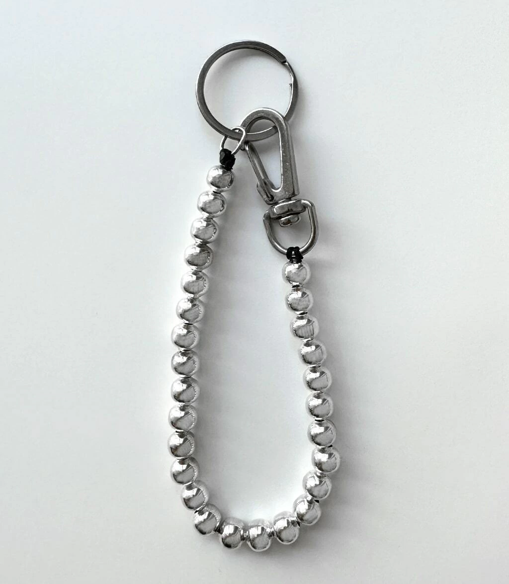 Podés usarlo como gancho para tus AirPods, llavero, charm o strap agregandole un adaptador de correa a tu celular. Realizado con cuencas de metal plateadas. Gancho y aro de metal en plateado. Medidas: largo total de 27 cm aprox.