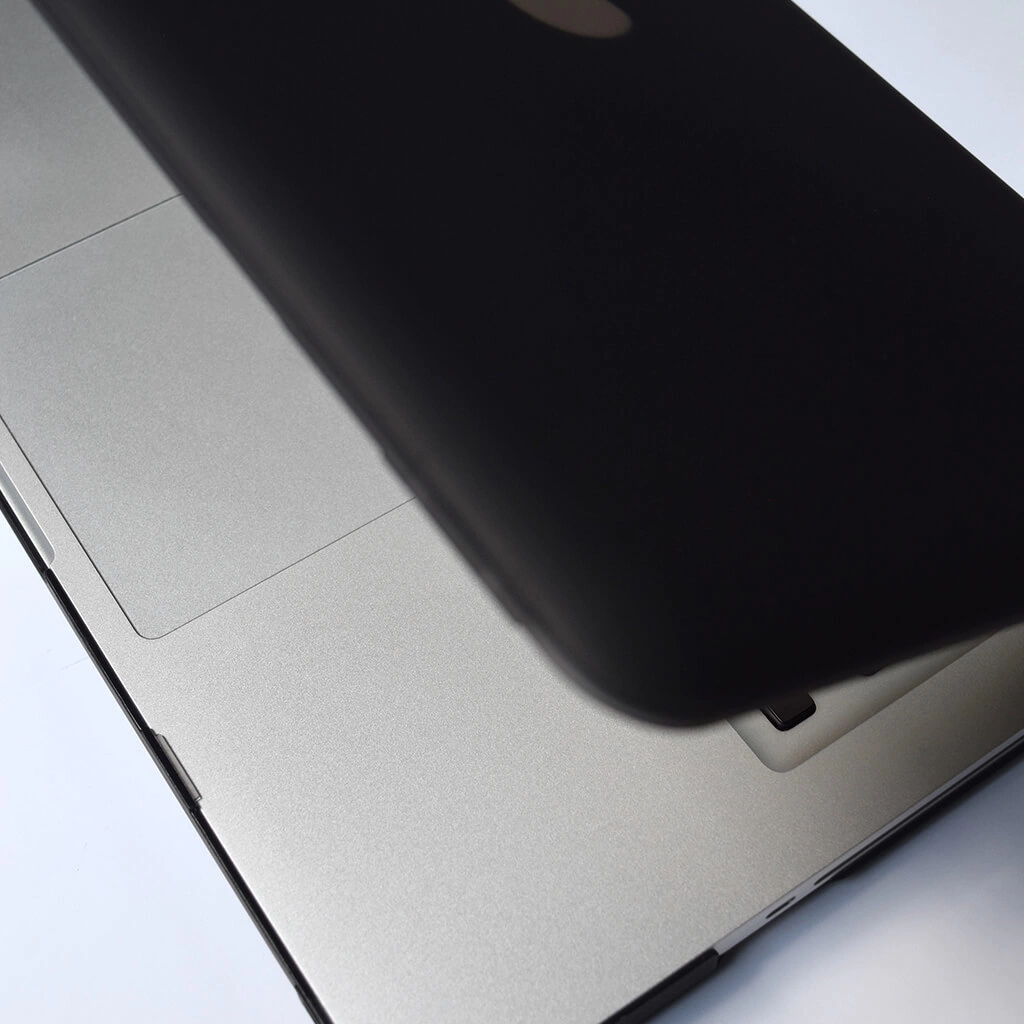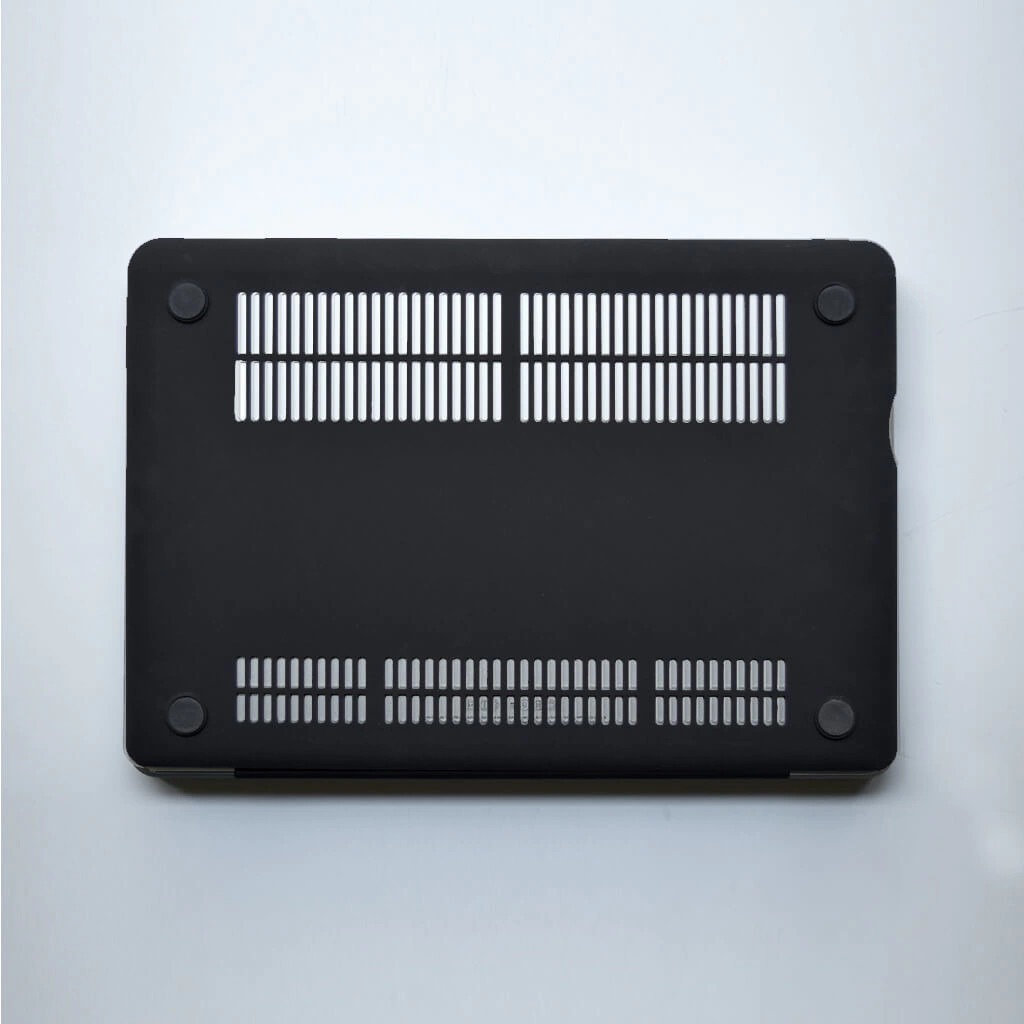 Las fundas están diseñadas en dos piezas para colocar en la base y frente de tu MacBook. Ambas piezas son negras traslúcidas con terminación mate.